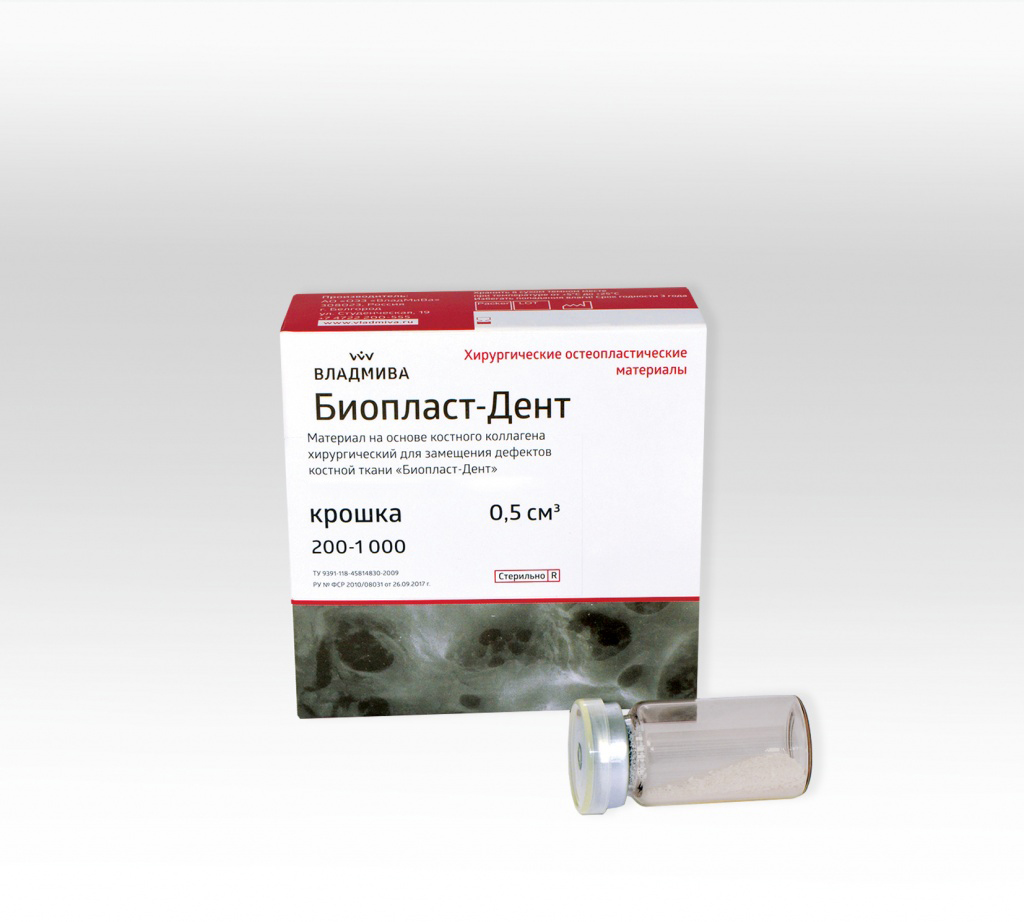 Материалы «Биопласт-Дент» представляют собой костную ткань КРС, очищенную методом химико-ферментативной обработки с сохранением гидроксиапатита биологического происхождения и пространственной архитектоники, что способствует фиксации биологически активных веществ на структурах биоматериала без снижения их биологической активности. Биоматериалы являются достаточно прочной, резорбируемой во времени матрицей (6-8 месяцев), со скоростью биорезорбции синхронизированной по времени с процессом образования новой ткани.