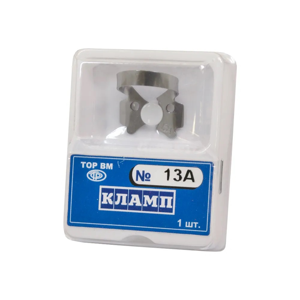 Кламп № 13А асимметричный кламп с горизонтальными зазубренными "челюстями" (tiger-тип), правосторонний, для верхних моляров с треугольной формой коронки, наиболее часто используется для наложения на верхние моляры, возможно наложение на третьи верхние моляры, ТОР ВМ