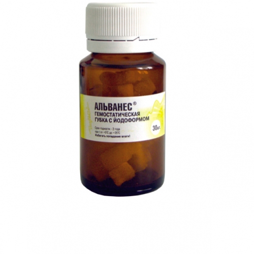 Альванес ГУБКА - антисептический, болеутоляющий, гемостатический рассасывающийся компресс для альвеол, с йодоформом. ОПИСАНИЕ: Кровоостанавливающая антисептическая коллагеновая губка «Альванес» предназначена для лечения и профилактики воспалительных осложнений в хирургической стоматологии и пародонтологии: после удаления зубов, в частности лечение альвеолита и пародонтальных абсцессов; а также заполнение пародонтальных карманов после местной противовоспалительной терапии или кюретажа.