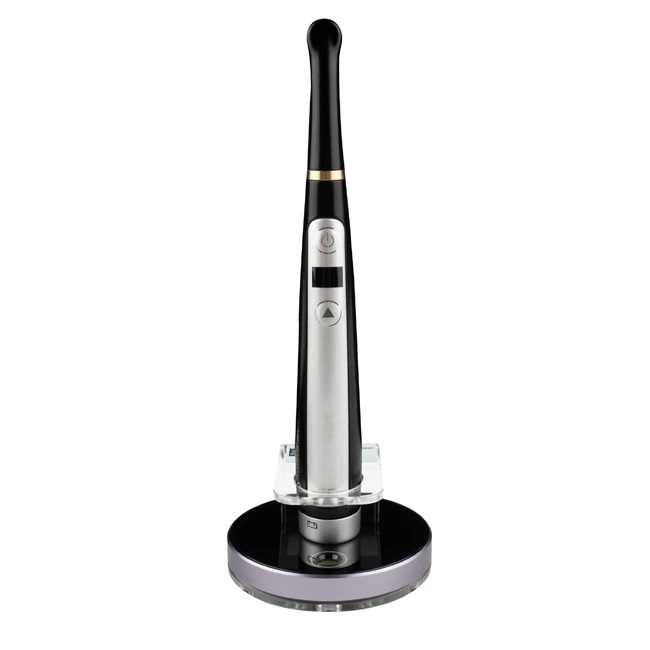 VRN Vafu Black беспроводная светополимеризационная лампа повышенной мощности в комплекте со сменным наконечником (кариес-детектор) и беспроводной зарядной станцией со встроенным радиометром. Она оборудована четырьмя светодиодами с тремя разными вариантами длины волны, охватывающими спектр 385-515 нм. Это позволяет максимально эффективно работать с современными светоотверждаемыми материалами. Высочайшая интенсивность светового потока дает возможность проникать сквозь керамику и полимеризовать базовые цементы на основе смолы подобно качественному галогеновому свету.