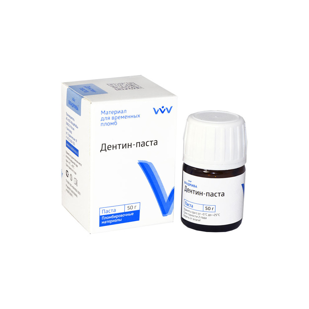 СОСТАВ И ОСНОВНЫЕ СВОЙСТВА Материал «Дентин-паста» является цинк-сульфатным цементом на полимерной основе и представляет собой готовую к применению однородную пасту, отверждающуюся под воздействием влаги полости рта. Материал "Дентин-паста" отверждается под воздействием влаги в течение 2-3-х часов, в процессе затвердевания материал расширяется, обеспечивая плотное краевое прилегание. «Дентин-паста» обладает высокой устойчивостью к нагрузкам и превосходной адгезией к твердым тканям зуба, не вызывает раздражения тканей полости рта.</virtues>